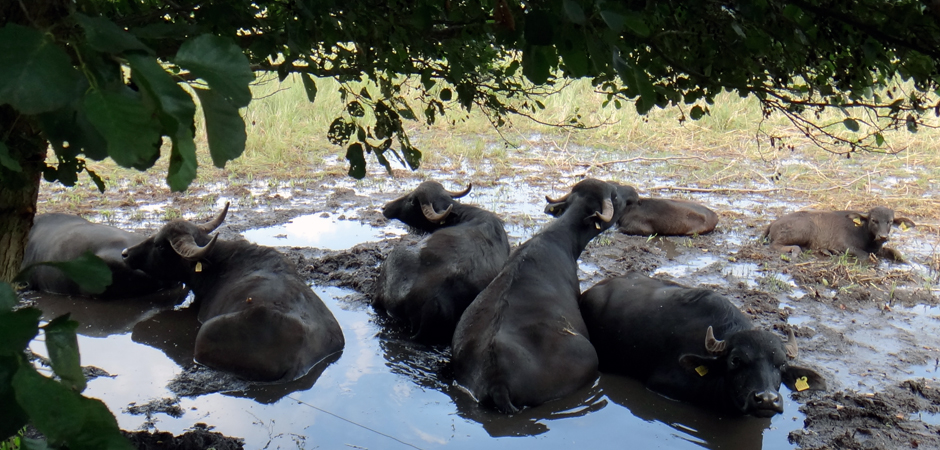 Die aus Italien stammenden genügsamen und sanftmütigen Tiere beeindrucken durch ihre Schönheit, aber auch durch die hohe Qualität ihres Fleisches und der Büffelmilch.